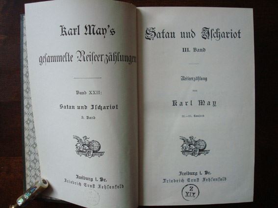 "Satan und Ischariot III" ist der 3. Teil der 3-teiligen "Satan und Ischariot" - Reihe und der 22. Band der gesammelten Reiseerzählungen Karl May's. Auf dem Einband ist die Verlagsbezeichnung "Karl May Verlag Fehsenfeld & Co. Radebeul - Dresden" und auf dem Deckblatt "Freiburg i. Br. Friedrich Ernst Fehsenfeld" aufgeführt. Bei dem Buchblock handelt es sich um die Auflage: 31. - 35. Tausend. Freiburger Buchblöcke erschienen ebenfalls in Einbänden mit dem Aufdruck "Verlag der Karl May - Stiftung Radebeul - Dresden". Es gibt wahrscheinlich keinen Buchblock mit der Verlagsbezeichnung "Verlag der Karl May - Stiftung Radebeul bei Dresden". Die erste „reine“ Radebeuler Ausgabe erschien unter der Verlagsbezeichnung "Karl May Verlag Radebeul bei Dresden" mit der Auflage: 42. - 46. Tausend.