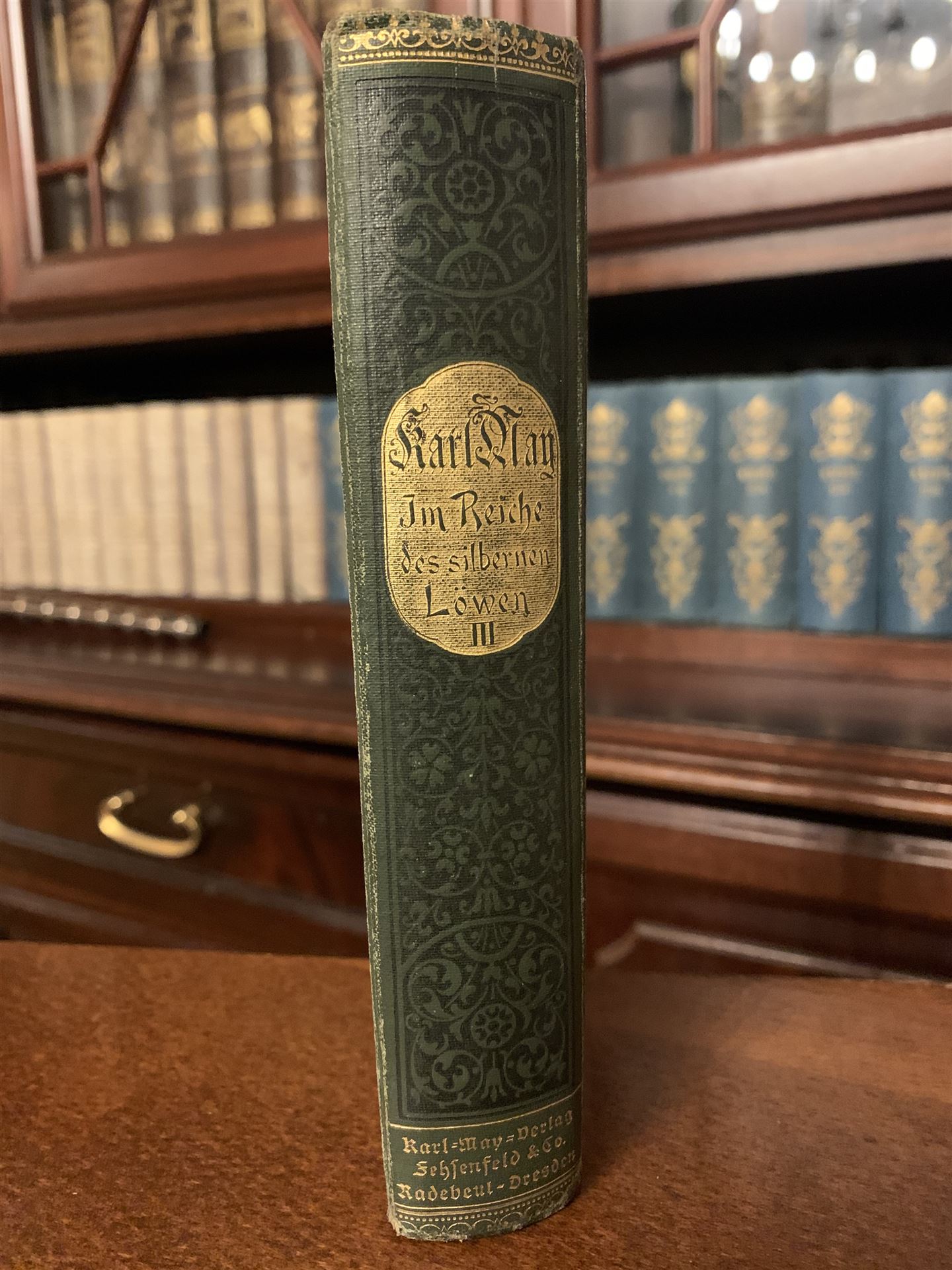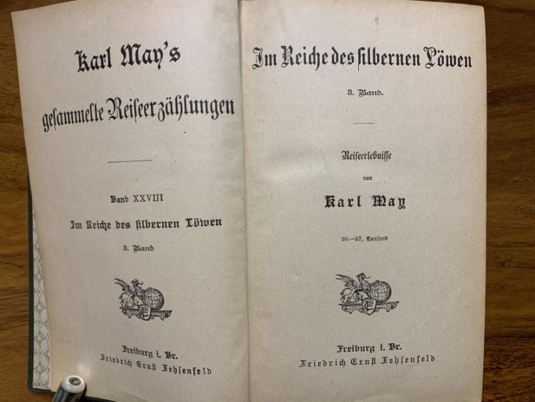 "Im Reiche des silbernen Löwen III" ist der 3. Teil der 4-teiligen Reihe und der 28. Band der gesammelten Reiseerzählungen Karl May's. Auf dem Einband ist die Verlagsbezeichnung "Karl May Verlag Fehsenfeld & Co. Radebeul - Dresden" und auf dem Deckblatt "Freiburg i. Br. Friedrich Ernst Fehsenfeld" aufgeführt. Bei dem Buchblock handelt es sich um die Auflage: 26. - 27. Tausend. Freiburger Buchblöcke erschienen ebenfalls in Einbänden mit dem Aufdruck "Verlag der Karl May - Stiftung Radebeul - Dresden". Es gibt wahrscheinlich keinen Buchblock mit der Verlagsbezeichnung "Verlag der Karl May - Stiftung Radebeul bei Dresden". Die erste „reine“ Radebeuler Ausgabe erschien unter der Verlagsbezeichnung "Karl May Verlag Radebeul bei Dresden" mit der Auflage: 32. - 34. Tausend.