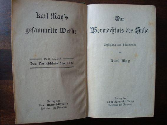 "Das Vermächtnis des Inka" ist der 39. Band der gesammelten Werke Karl May's. Auf dem Einband ist die Verlagsbezeichnung "Verlag der Karl May - Stiftung Radebeul - Dresden" und auf dem Deckblatt "Verlag der Karl May - Stiftung Radebeul bei Dresden" aufgeführt. Es handelt sich um die Auflage: 16. - 20. Tausend, welches die erste Radebeuler Auflage darstellt. Innerhalb dieser Auflage erschienen beide Einband-Aufdrucke: „Verlag der Karl May - Stiftung Radebeul - Dresden" und "Karl May Verlag Fehsenfeld & Co Radebeul - Dresden". Vor dieser Auflage erschien "Das Vermächtnis des Inka" als Buch bei der Union Deutsche Verlagsgesellschaft in den Auflagen 1. – 15. Tausend.